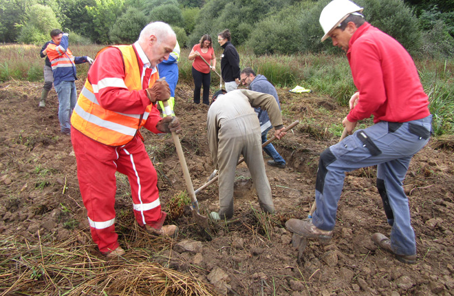 Jeudi 24 septembre, l'antenne Nouvelle-Aquitaine de l'Union Nationale des Industries de Carrières et d'Extraction de Matériaux est venue prêter main forte au Cen Nouvelle-Aquitaine et au Syndicat d'Aménagement du Bassin de la Vienne pour restaurer deux mares et en créer deux autres dans le marais.