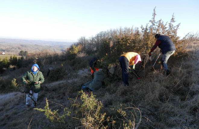 Le chantier a constitué à débroussailler les genévriers sur abondant qui colonisent progressivement une pelouse calcicole entrainant la disparition des espèces végétales des milieux ouverts. Le Puy de Guimond, haut lieu de la faune et de la flore calcicole de notre région, a été racheté par la commune d'Ayen et confié en bail au CEN afin de le préserver. Cette première intervention sur ce site, s'insère dans le programme de restauration des buttes calcicoles du secteur d'Ayen développé par le CEN.