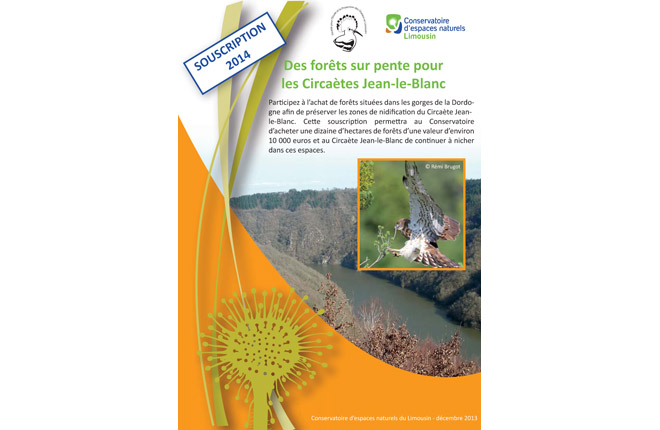 Participez à l’achat de forêts situées dans les gorges de la Dordogne afin de préserver les zones de nidification du Circaète Jean-le-Blanc. Cette souscription permettra au Conservatoire d’acheter une dizaine d’hectares de forêts d’une valeur d’environ 10 000 euros et au Circaète Jean-le-Blanc de continuer à nicher dans ces espaces.