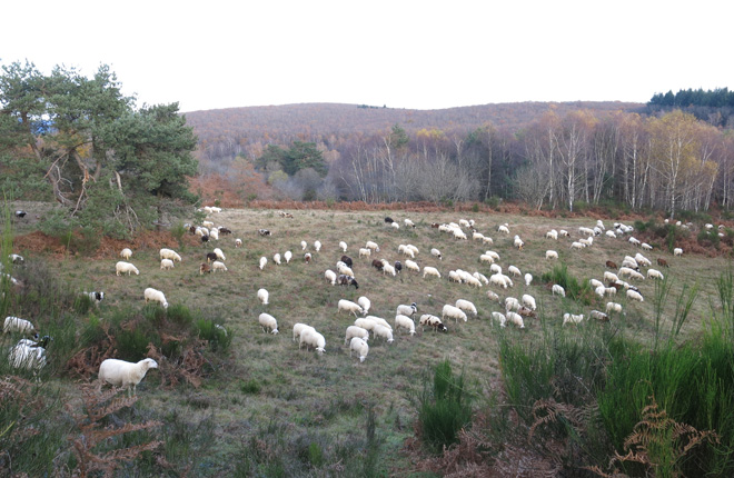 Le bilan des actions menées amène à réfléchir à de nouvelles solutions de pâturage sur les parcs initialement conventionnés avec la commune, mais aussi sur le Puy dans son ensemble. Le choix est pris de s’orienter vers du pâturage ovin avec de forts effectifs sur des temps courts. Le CEN Limousin s’est ainsi lancé dans la recherche d’un important troupeau d’ovin auprès de ses éleveurs partenaires. Ce sont les éleveuses de la Ferme de Lachaud de Gentioux-Pigerolles qui acceptent de réaliser cet essai sur un pâturage automnal. Ainsi 300 ovins pâturent actuellement les parcs pour la plus grande satisfaction du Conservatoire et la joie des randonneurs du sentier des poètes à la recherche des Roches Brunagère. Pour les éleveuses, qui pratiquent une agriculture biologique en faveur de la biodiversité et des paysages, c’est l’amélioration de leur autonomie fourragère qui est visée. En effet, soucieuses de diversifier les sources d’alimentation, elles profitent des ressources naturelles des landes sèches à cette période de l’année (genêts, callune, ronce, etc.) et économisent ainsi les compléments de foin. Ces pratiques et expérimentations s’intègrent dans divers réseaux d’éleveurs et plus particulièrement celui du groupe Herbe de la FRCIVAM Limousin (l’ADAPA).